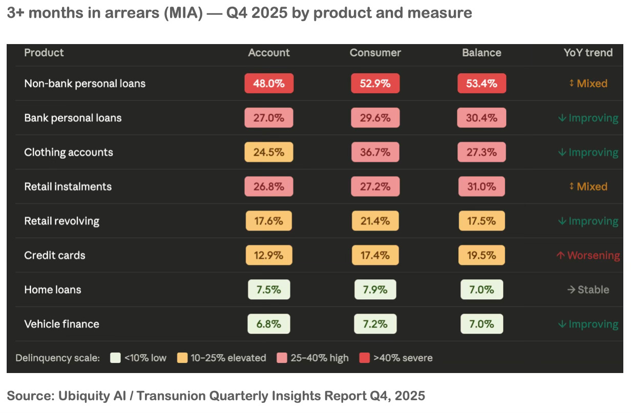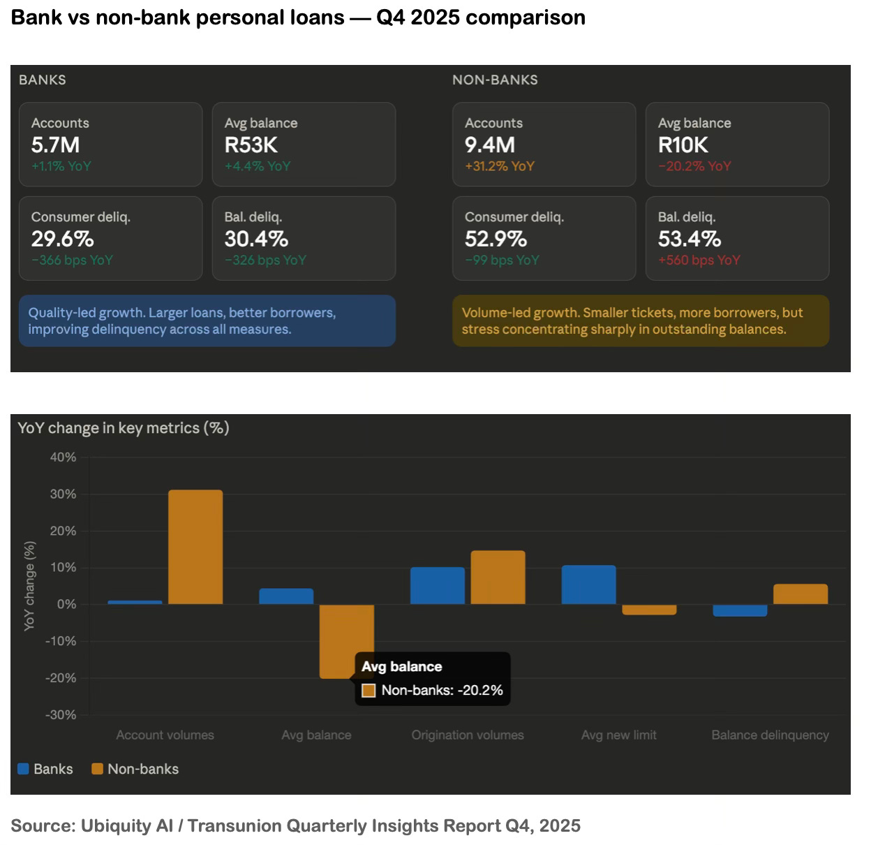 The non-bank personal loan market tells the counterpoint to this story. Account volumes surged 31.2% year on year. Originations grew 14.7%. But average account balances fell 20.2% to just R10,000 — small-ticket, short-cycle lending that banks won’t touch. This is not financial inclusion in a celebratory sense. It is the market routing around bank conservatism to serve borrowers who have nowhere else to go. And as the report notes, balance-level delinquency in non-bank personal loans rose a striking 560 basis points year on year. The stress isn’t spreading to more borrowers - it’s concentrating among those already struggling.