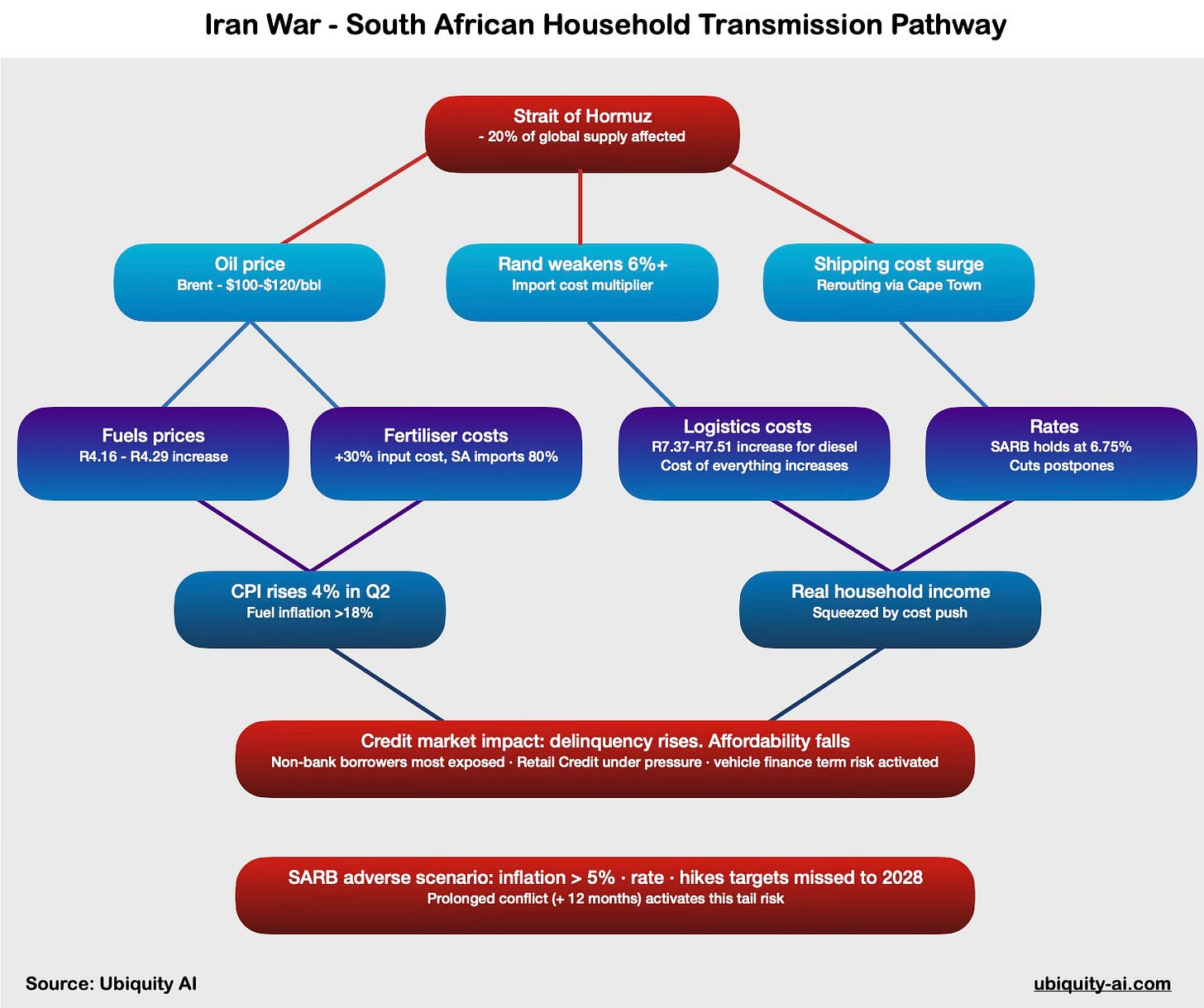 The Q4 2025 data is the last photograph of the patient before the diagnosis. The next quarterly report - Q1 2026, due sometime mid-year - will be the first picture of how the patient is responding to treatment. The prognosis depends almost entirely on something South African monetary policy has no influence over whatsoever: how long the United States and Israel continue their campaign against Iran, and what happens to the 20 million barrels of daily oil flow that once passed through the Strait of Hormuz.