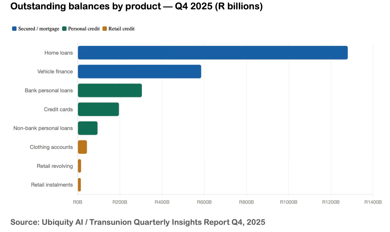 First, the landscape. South African consumer credit is dominated by a handful of large products. Home loans alone represent over R1.27 trillion in outstanding balances. Vehicle finance - over R584 billion. Bank personal loans - nearly R304 billion. Together, these three products constitute approximately 87% of all formal consumer credit outstanding. Credit cards, at R195 billion, and the sprawling non-bank personal loan market, at R93.8 billion, complete the picture for secured and semi-secured lending. Retail credit - clothing accounts, revolving, and instalments - is large in account numbers but modest in rand terms, its importance lying not in balance size but in its role as the credit safety valve for lower-income South Africans.